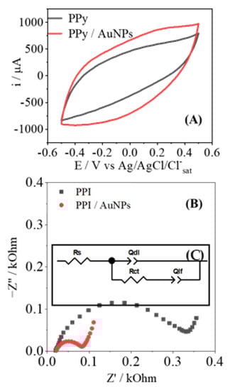 (A) CV for the electrodes modified with just PPy (black) and PPy/AuNPs (red). The Nyquist plot is shown in (B) from electrodes modified with PPy (black) and with PPy/AuNPs (red). The equivalent circuit used to model the EIS results is also inserted as (C).