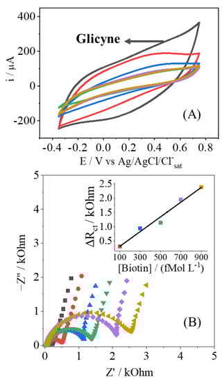 Cyclic voltammetry (A) and Nyquist plot (B) of the EIS measurement to Biotin detection (100 up to 900 fmol L−1) indicated by colors in both CV and EIS.