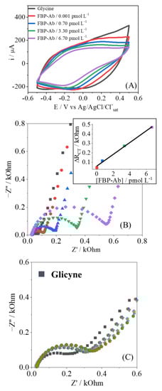 Cyclic voltammetry (A) and Nyquist plot (B) to FBP-Ab detection (0.001 up to 6.70 pmol L−1); (C) the EIS response in stability test to 0.001 pmol L−1 of FBP-Ab. The gray measurement was performed in the blank step, while the others correspond to the same antibody concentration.