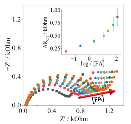 Finally, the FBP/Folic Acid biosensor was assembled on the PPy-NT/AuNPs platform, all electrochemical experiments were the same ones descried earlier for the detection of the analyte. Folic Acid has a great affinity for FBP, and the impedimetric response is found in Figure 6, in the concentration range from 0.02 up to 113.3 nmol L−1, in triplicate. The analytical curve was inserted; the limit of detection (LOD) was calculated as 0.030 nmol L−1, and the limit of quantification (LOQ) was 0.090 nmol L−1, indicating that the proposed biosensor herein can detect and quantify the range of concentration of clinical interest, which is around 11 up to 34 nmol L−1 [,]. As this biomarker can be found as a group of molecules, many different configurations of biosensors based on folate can be found in the literature, and the simple comparison between analytical parameters is not always easy to study. Nonetheless, in Table 3, different information is presented to better analyze the recent development in this issue.