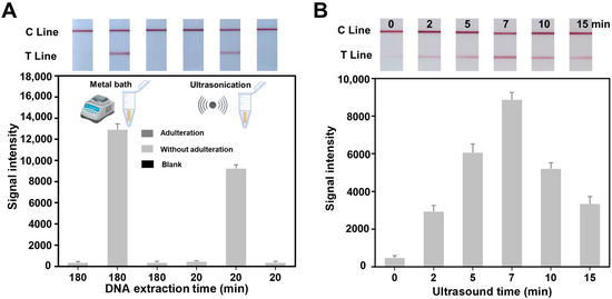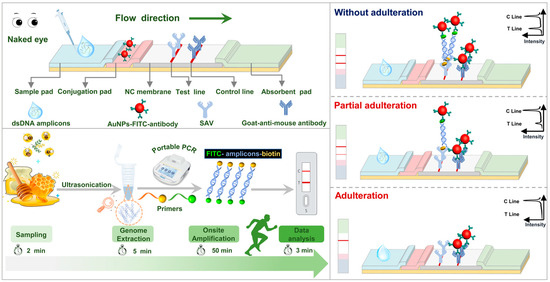 For the rapid identification of the floral origin of honey, the genetic authentication strategy with the molecular LFS is designed and demonstrated in Figure 1. The optimized rapid pretreatment of honey samples can be completed by ultrasonication and magnetic extraction. With the ingeniously designed primer set functionalized with biotin and FITC, respectively, the sequence of target floral origin can be well and on-site amplified with the portable thermal controller in 50 min; this will produce an enormous number of dual-labeled functional amplicons. When the dual-labeled amplicons were loaded onto the LFS, the dual-labeled amplicons will firstly be recognized by the Anti–FITC–GNP via specific antigen−antibody interaction on the conjugate pad, and then be trapped by pre-immobilized SAV on the T line. Meanwhile, excess free Anti−FITC−GNP will finally be retained by the goat anti−mouse antibody on the C line of the LFS. On the contrary, without target floral origin, it will not induce the production of dual-labeled amplicons. Additionally, the loading of amplification mixture will also not induce the retention of Anti−FITC−GNP conjugates on the T line and the coloration of the T line of the LFS. With this designed genetic authentication strategy, with the presence of target floral origin components in the honey, the target amplicons can be produced and there will be both T line and C line on the molecular LFS. On the contrary, if the honey is entirely fake or partially adulterated with other sweet components, there will be no T line or reduced intensity on the T line while the C line will remain unchanged, which indicates the validation of each test of the LFS. Moreover, the complete genetic authentication of the honey’s floral origin can be performed by normal operators with the portable device in less than 1 h, which will contribute greatly to the guarantee or supervision of food quality, especially honey products. Notably, the primer set designed and adopted in this research is specific for the chloroplast maturase K gene of locust. For the detection of other plant-borne components, only the re-design of primer is required when using this reported method.