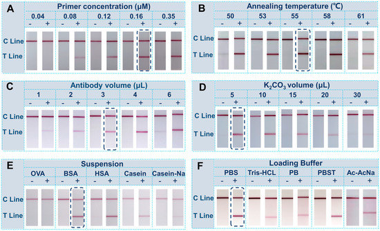 Optimization of experimental parameters: (A) Primer concentration (0.04 μM, 0.08 μM, 0.12 μM, 0.16 μM and 0.35 μM); (B) Annealing temperature (50 °C, 53 °C, 55 °C, 58 °C and 61 °C); (C) Volume of antibody for conjugation (1 μL, 2 μL, 3 μL, 4 μL and 5 μL 1 mg/mL antibody); (D) Volume of K2CO3 for pH adjustment (5 μL, 10 μL, 15 μL, 20 μL and 30 μL 0.1M K2CO3); (E) Suspension species (0.5%OVA, 10% BSA, 10% HSA, 0.5% Casein and 0.5% Casein−Na); (F) Categories of loading buffer (10 mM PBS, 10 mM Tris−HCL, 10 mM PB, 10 mM PBT and 10 mM Ac−AcNa).
