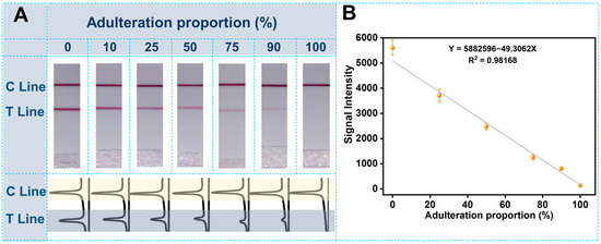Authentication performance of the amplification−assisted molecular LFS: (A) Visual judgment results of honey samples adulterated at different ratio (0%, 10%, 25%, 50%, 75%, 90% and 100%, v/v%) and the corresponding quantitative curves analyzed by ImageJ; (B) Calibration curve of the authentication performance.
