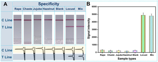 To verify the critical properties of the rapid genetic authentication strategy for honey adulteration, other different common honey samples, with different floral origins, were artificially added to the confirmed real Locust honey at different ratios. Following this, all the artificial adulterated samples were rapidly treated as demonstrated in Section 2.2 and detected with the genetic authentication strategy of the molecular LFS. All detection results of the adulterated Locust honey samples at different ratios were demonstrated in Figure 4. In detail, with the increase in adulteration ratio, the Locust-origin component will be decreased, and the signal on the test line will also be decreased. When the honey sample was entirely fake there was no Locust−origin component in the sample. Accordingly, there was no signal on the test line of the 100% adulteration group (the right strip in Figure 4A). The corresponding ImageJ treated quantitative curves were also shown in Figure 4A; when the adulteration ratio was as low as 25%, the distinguishable variation optical intensity was able to be differentiated just by visual observation. Furthermore, the linear calibration curve was also constructed based on the optical intensities on the test lines of different adulteration ratios. The detection limit of adulteration can be as low as 7.3% by the rule of a 10% signal decrease, compared with the blank group (100% real Locust sample of the left strip in Figure 4A). Meanwhile, the specificity of the constructed genetic authentication strategy was also considered. Other common honey samples—including the rape honey, chaste honey, jujube honey and hazelnut honey samples—were adopted as the control groups. From the results shown in Figure 5, it is clear that only the pure Locust group and the mixture with the presence of Locust honey produced an obvious signal on the test line, indicating the existence of the target Locust component in the honey. However, for other control honey samples, there was no optical signal on the test lines of the different LFS. Meanwhile, for accurate evaluation, the honey sample adulterated at different ratios were determined with the LFS continuously for 10 repetitions. Results show that there is no obvious difference in both the linear relationship and the sensitivity among the 10 tests (See detailed results in Figure S1 of Supporting Information). Moreover, the LFS of the same batch have also been used for the detection of the same sample at different times. Following this, the inter and intra-day variation were calculated to be 6.82% and 4.31%, and were in the acceptable range of lateral flow strip−based methods. These results strongly prove the excellent specificity of this genetic authentication strategy for the authentication of honey samples.