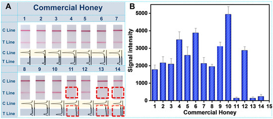 Lastly, 14 commercial honey samples, purchased from the local supermarket, were identified with this genetic authentication strategy using the molecular LFS. All detection results are shown in Figure 6; it can be observed that there are obvious signals on the test lines of samples 1, 2, 3, 4, 5, 6, 7, 8, 9, 10 and 12, indicating that there are target Locust components in these commercial honey samples. It should also be noted that there are no observable signals on the test lines of samples 11, 13 and 14. The results primarily indicate that these three samples may be related to the adulteration. These on-site screening results provide direct evidence for further official confirmation. To demonstrate a convincing reliability, the same honey samples were also tested by quantitative real time PCR for confirmation. Results in Table S1 are in great accordance with the obtained PLFS results, indicating the effectiveness and potential practical capability in food quality control.