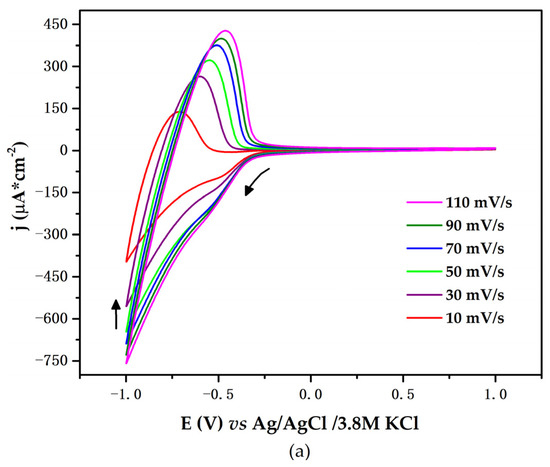 The linear plot of anodic current (jpa) vs. the square root of velocity (υ) suggests that the electrode process is diffusion-controlled; the ions that compensate for the accumulated charge on the surface of the electrode flow to the electrode from a region of lower to higher concentration until homogeneity is achieved. The linear equation for anodic current can be expressed as follows: jpa = 42.94υ + 9.24; R2 = 0.9813. Figure 6c shows the relationship between the logarithm of the anodic peak current vs. the logarithm of the scan rate; the linear equation is expressed as: log jpa = 0.4708 log υ + 1.6931; R2 = 0.9792. The slope is relatively close to the theoretical value of 0.5 for a purely diffusion-controlled process. To maintain a reasonable electrode response, a scan rate of 10 mV/s was chosen for further characterization.