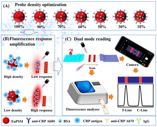Lateral flow immunoassay (LFIA), as the most widely used biosensor, was employed to realize the detection of many disease markers due to its characteristics of rapidity, cheapness, and ease of operation [8,9,10]. However, the low sensitivity of conventional LFIA usually limits its application in hs-CRP detection, due to the weak colorimetric signal generated by conventional nanoparticles (e.g., AuNPs [10], AgNPs [11]). Nowadays, layered transition-metal dichalcogenide (TMD) materials (e.g., VS2 nanosheet [12] or MoS2 nanosheet [13]) have been creatively employed in LFIA development as colorimetric signal reporters, due to their highly specific surface areas and good protein adsorption ability [14]. Although these TMD-LFIAs exhibit good performance, their application is still limited by the difficulty of quantitative detection. Alternatively, fluorescence nanoparticles (e.g., fluorophores, quantum dots (QDs), and upconversion nanoparticles (UCNPs)) were employed, where the fluorescence signal can be directly quantified by photoelectric sensors [15,16]. However, fluorophores-based LFIAs suffer from a relatively limited sensitivity, due to narrow Stokes shift (20–30 nm), photobleaching, and low emission intensity [17]. The excellent fluorescence properties of QDs and UCNPs support the development of optimized LFIA [18,19], but unstable and complex preparation and modification processes limit their large-scale application [17]. Recently, the europium-chelate polystyrene microsphere (EuPSM) possesses a longer fluorescence lifetime (µs) than traditional fluorophores (ns), allowing signal to be collected beyond the lifetime of background fluorescence [20]. Moreover, its long Stokes shift ensures that incident light from the excitation source (λ~330–340 nm) does not interfere with collection of light by the detector (λ~610–620 nm) [21]. These attractive traits create new opportunities in constructing high-sensitivity LFIAs. Considering that the size of EuPSM is usually approximately 250–300 µm, much larger than that of traditional fluorescence nanoparticles, it may significantly increase the number of binding sites on the surface of the microsphere. Thus, the amplified fluorescence signal may be obtained through optimizing modified probe (e.g., antibody) density [22,23]. The femtosecond pulsed UV radiation source-based photonic immobilization technique (PIT) can effectively improve the binding ability of the antibody, while reducing the degeneration of biomolecules affected by UV light [24], which is expected to achieve the regulation of probe density but may be limited by the high requirements of operation and equipment. Hence, optimization of EuPSM-based LFIA based on simpler and more effective ways is still needed to meet the requirements of ultra-sensitive POCT platform.