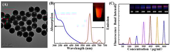 (A) TEM images of EuPSM. (B) Absorption spectrum and emission spectrum of EuPSM. (C) Estimation of probe saturation concentration on EuPSM.