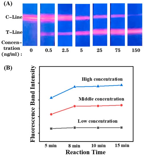 After optimizations of the running buffer and antibody concentration on the T-line and C-line, the detection feasibility of the proposed UCNPs-LFIA was implemented by detecting CRP with gradient concentrations. As shown in Figure 3A, the developed EuPSM-LFIA has clear bands at the T-line and C-line in detection, showing low background interference. The fluorescence intensity of the T-line increased with the increasing concentration of CRP, and there are no false positive signals at the T-line at a negative detection, validating its detection feasibility. The signal can remain stable after 8 min, indicating that the developed platform can complete detection within 8 min (Figure 3B).