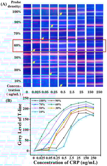 Taking the group of 100% probe density as an example, the fluorescence photos show that the fluorescence band was enhanced gradually at the T-line and faded at the C-line with the increase in the CRP concentration. The T-line showed a weak fluorescence band at the concentration of 0.5 ng/mL and no fluorescence signal at lower level, which means that the lowest distinguishable concentration by the naked eye can reach 0.5 ng/mL. In addition, due to the strong binding ability of particles with high probe density, they are more likely to be captured by the T-line, so that the fluorescence signal on C-line decreases with the increase in CRP concentration. As shown in Figure 4A, the fluorescence band of the C-line disappeared at the concentration of 150 ng/mL, which was identified as the highest valid concentration, as the absence of the fluorescence band at the C-line is usually considered as a sign of LFIA failure. With the antibody density decreasing from 100% to 60%, the lowest distinguishable concentration decreased gradually and achieved 0.025 ng/mL at 60% probe density. When the probe density is below 60%, the lowest distinguishable concentration starts to rise again, which returned to 0.5 ng/mL at 10% probe density. The main reason for this is that the fluorescence signal is determined by both response sensitivity and binding capacity. When the antibody density was lower than 60%, the EuPSM-anti-CRP Ab8# was not easily captured by anti-CRP Ab7# at the T-line because of low binding capacity, resulting in reduced fluorescence signal. In short, antibody density on the surface of particles not only affects the response of fluorescence signals to biological signals, but also affects the binding capacity. With the antibody density decreasing, the detection sensitivity first decreases and then increases, reaching the best value at 60% of antibody density. In order to make the results more intuitive, we extracted the average gray value of the T-line and drew the relationship curve. As shown in Figure 4B, the grey level of 60% probe density changed earlier with the increased concentration, and its fluorescence intensity was also highest, indicating that its detection performance is best. In addition, with the decrease in antibody density, the C-line signal gradually decreases with the increase in the target concentration, which can effectively improve the detection range of the detection platform.