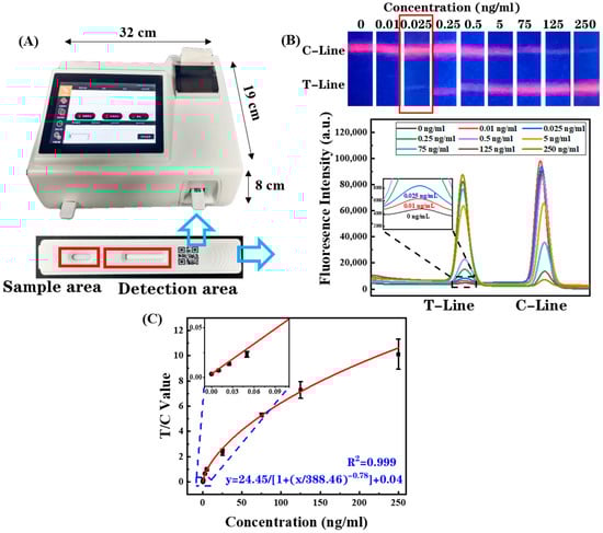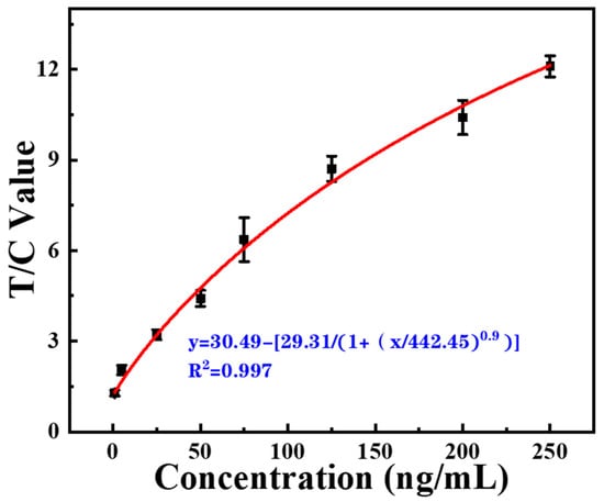 Particularly, since the fluorescence signal at the C-line changes with different target concentrations, the fluorescence intensity ratio of the T-line and C-line (T/C) corresponding to target concentrations showed a good upward trend. The use of the T/C value as the detection signal not only amplifies the range of signal variation, but also effectively improves the lower detection limit and upper detection limit. Standard curves of the T/C value and CRP concentration were plotted according to four parameters. As shown in Figure 6C, the fitted curves with a high correlation coefficient (R2 = 0.999) were obtained, showing high accordance with the detection results of the fluorescence photos. Furthermore, the analytic sensitivity (T/C value/concentration) decreases with the increase in concentration.