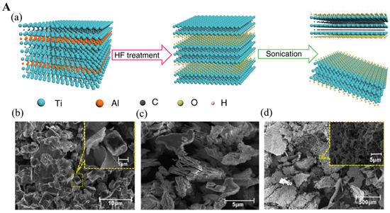 (A). (a) Schematic of Ti3C2Tx MXene synthesis via HF-etching. The SEM images for (b) Ti3AlC2 MAX phase, (c) multilayer Ti3C2Tx MXene, (d) delaminated Ti3C2Tx MXene nanosheets. Reproduced with permission from Refs. [24,28]. (B). (a) Ti2C MXene synthesis process. (b,c) TEM for exfoliated Ti2C MXene nanosheets. Reproduced with permission from Ref. [30]. (d) X-ray diffraction spectra for Ti3C2 MXene its MAX phase precursor. Reproduced with permission from Ref. [31].