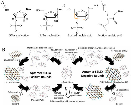 (A) Chemical structures of nucleic acids: (a) DNA and RNA nucleotide, (b) locked nucleic acid, (c) peptide nucleic acid. (B) Schematic illustration of aptamer selection by positive and negative SELEX methods. Reproduced with permission from Ref. [60]. Copyright 2022, Elsevier.