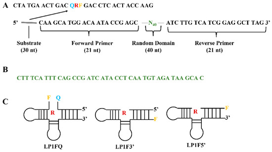 (A). The DNA general construct in the library for selection of DNAzyme specific to Legionella pneumphila. (B) The random domain of selective Legionella pneumphila DNAzyme. (C) Representative construction of selected DNAzyme. R: Adenosine ribonucleotide, F: Fluorescein tail molecules, Q: quencher tail molecules (DABCYL). Redrawn based on Ref. [75].