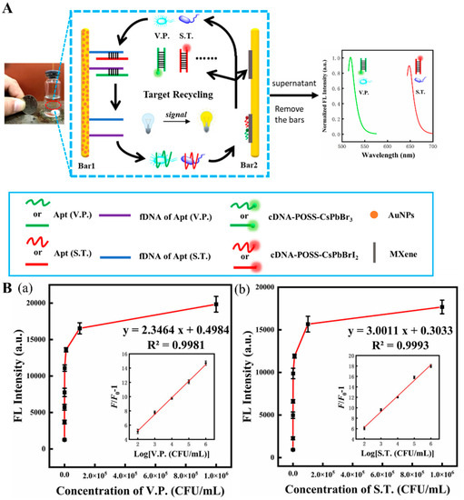 Salmonella typhimurium (ST) is another dangerous foodborne pathogen that causes high morbidity and mortality [113]. A novel dual-target fluorescent aptasensor was fabricated for live ST and VP analysis [81]. As shown in Figure 6A, this fluorescent device was assembled by two magnetic bars (1 and 2), where bar 1 was used as a biorecognizer for target recognition and capture, and bar 2 served as a signal amplifier that released the enhanced fluorescent signal. Bar 1 was coated with aptamers capable of recognizing and capturing two bacteria strains. Bar 2, modified with Ti3C2 MXene nanosheets, served as a platform to support and immobilize complementary DNA (cDNA) tailed with polyhedral oligomeric silsesquioxane-perovskite quantum dots probes (cDNA-POSS-PQDs). When the two target bacteria were present, they were captured by their specific aptamers on bar 1 and subsequently released with their aptamers into the aqueous supernatant. Due to the agitation, bacteria–aptamer conjugate attached to the cDNA on bar 2 and then tore away the cDNA-POSS-PQDs from bar 2, which finally provided a fluorescent response in the solution. The live bacteria can be released from the aptamer and become free again due to the reaction between the aptamer and cDNA-POSS-PQD with low Gibbs free energy (∆G < 0), leading them to trigger the next detection cycle. Ultimately, the fluorescent response was amplified and reached a maximum that significantly increased the biosensor sensitivity. LODs of 30 CFU/mL and 10 CFU/mL, respectively, for ST and VP, and a linear range of 102 to 106 CFU/mL were obtained (Figure 6(Ba,Bb)). Therefore, this biosensor can sensitively detect the target bacteria and differentiate the live from the dead ones.