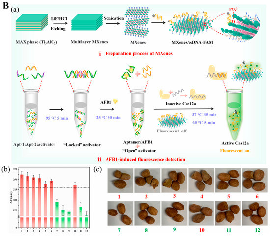 - Wu, Z.; Sun, D.-W.; Pu, H.; Wei, Q. A novel fluorescence biosensor based on CRISPR/Cas12a integrated MXenes for detecting Aflatoxin B1. Talanta 2022, 252, 123773. [Google Scholar] [CrossRef] [PubMed]