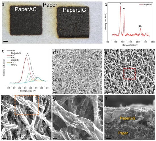 (a). The optical image of fabricated PaperAC and PaperLIG. Scale: 1 mm. (b) Raman spec-trum of PaperLIG material. Three prominent peaks are found in the Raman spectrums. (c) The high-resolution C1s XPS spectrum of PaperLIG. The raw curve was fitted with peaks corresponding to five carbon species. (d,e) SEM images of filter paper and PaperLIG. Scale: 100 µm. (f). A magnified SEM image of the red rectangular part of (e). Scale: 20 µm. (g) A magnified SEM image of the orange rectangular part of (f). Scale: 10 µm. (h) A cross-sectional SEM image of PaperLIG. Scale: 33.3 µm.