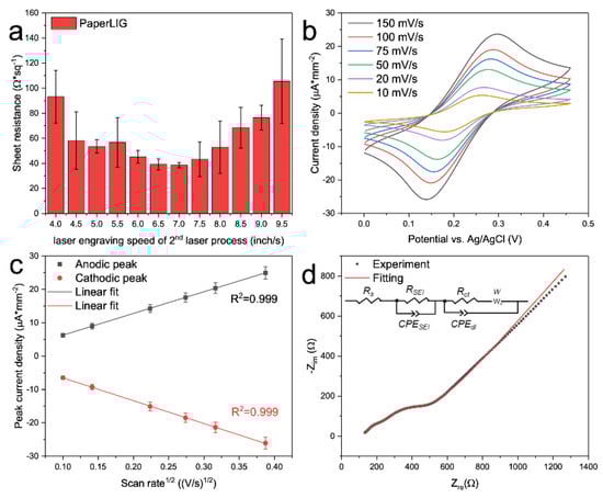 (a) Sheet resistance measurement of PaperLIG (n = 10) fabricated with various laser en-graving speeds of second laser processing. (b) Cyclic voltammetry of PaperLIG electrode in the PBS solution containing 5 mM K3Fe(CN)6/K4Fe(CN)6 with 0.1 M KCl under different scan rates (10–150 mV/s). (c) The plot of peak current density (n = 10) versus the square root of the scan rate for the CV of PaperLIG electrodes (b). (d) Nyquist plot of EIS of PaperLIG electrode in the PBS solution containing 5 mM K3Fe(CN)6/K4Fe(CN)6 with 0.1 M KCl. The inset shows the equivalent circuit used for fitting the experiment result.