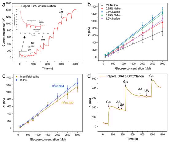 The amperometric approach was used to evaluate the sensing performance of the PaperLIG-based glucose biosensor, as illustrated in Figure 4a. As shown in the inset of Figure 4a, prior to the injection of glucose, the solution was magnetically stirred three times. It was noted that magnetic stirring generated the fluctuation of the current signal, but no current increment was observed, indicating that magnetic stirring did not cause the current response of the biosensor. As Figure 4a shows, the current signal increases after adding glucose into the solution, and this applied potential (−90 mV) is much lower than that of most developed LIG-based glucose biosensors (Table S2), which can avoid the oxidation of possible redox-active interfering substances in the saliva sample []. The Nafion concentration for this first biosensor was 0.25%, and the biosensor showed a linear range between 0.1 and 3 mM for glucose levels in the PBS with good linearity (R2 = 0.995) (Figure 4b). The LOD was determined as the mean background + 3 SDs of the background [], and the LOD was around 50–75 µM for this glucose biosensor. As a comparison, the PaperLIG/GOx/Nafion (0.5%) biosensor was also prepared and measured in the PBS using the amperometric method under −90 mV (Figure S5a). Previously, it was reported that graphene material can facilitate the DET (direct electron transfer) of GOx, which might be employed to develop the third generation glucose biosensor [,,]. As the co-enzyme of GOx, it was reported that the redox potential for FAD on the LIG electrode is around −485 mV []. As demonstrated in Figure S5, no obvious current response could be observed, which indicated that under applied potential (−90 mV) the direct electron transfer from the enzyme to the electrode was not feasible and the usage of a mediator was necessary.