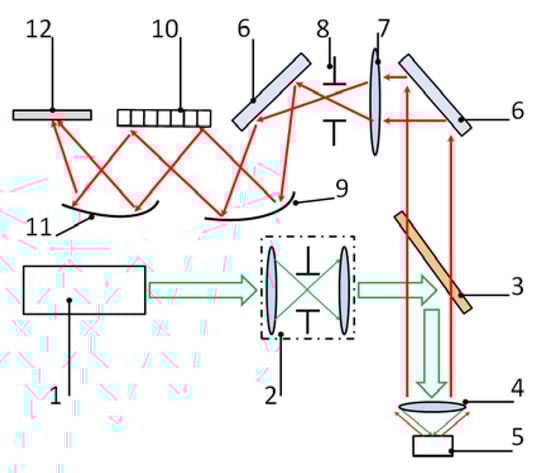 Design of the Raman spectroscopy setup: 1—laser source; 2—spatial filter; 3—edge-filter; 4—lens; 5—sample; 6—mirror; 7—condenser; 8—entrance slit of the spectrometer; 9, 11—aspherical mirrors; 10—diffraction grating; 12—CCD camera.