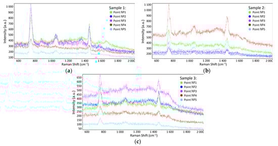 SERS spectra examples at different spatial points on the substrate having: (a) a pure buffer medium; (b) an influenza A virus in the buffer medium; (c) an influenza B virus in the buffer medium. The spectra of one sample taken at different points are indicated by different line colors.