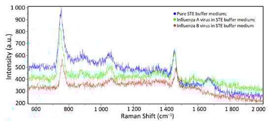 The Raman spectra of the influenza A and B containing samples are visually similar to the buffer medium spectra due to the strong signal from the latter. In this case, the differentiation of spectra and virus detection become complicated (see Figure 5), prompting the use of mathematical processing methods (see Section 3.3).