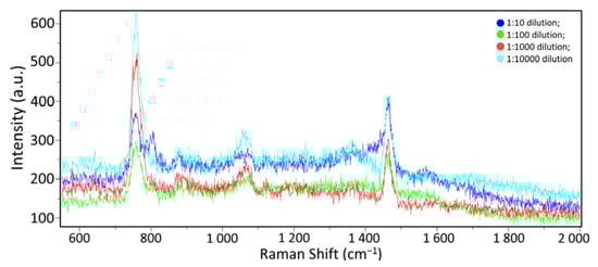 To determine the method sensitivity limits of the SERS spectra and classification using mathematical processing, the suspension with the influenza A virus was diluted with the STE buffer medium in various ratios: 1:10, 1:100, 1:1000, and 1:10,000. The initial protein concentration of the sample with the viral suspension was 500 µg/mL, according to the Lowry method []. For this purpose, the STE buffer medium was poured into four test tubes in portions of 10 μL. Then, 1 µL of the influenza A virus concentrated suspension was added to the first tube and thoroughly mixed. Next, 1 µL was taken from the resulting suspension and put into the next tube, etc. The protein concentration in the resulting diluted samples was 50 μg/mL, 5 μg/mL, 0.5 μg/mL, and 0.05 μg/mL, respectively. The samples were then placed on a SERS substrate and dried. The process of obtaining Raman scattering spectra was the same as the method described in Section 3.1; ten samples were obtained for each concentration. The spectra did not differ visually, as shown in Figure 6.