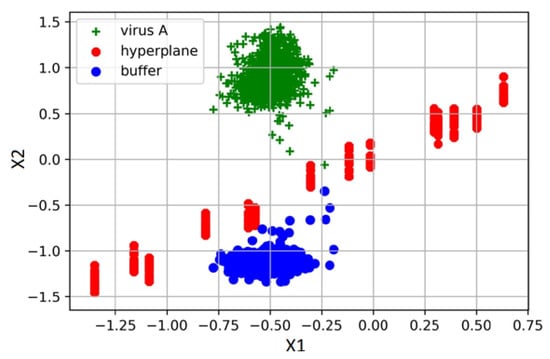 Visualization of spectra clustering of the pure STE buffer medium and influenza A virus in the STE buffer medium using projection onto support vectors X1 and X2. The red dots mark the projection of hyperplane points, which allows to classification of the spectra.