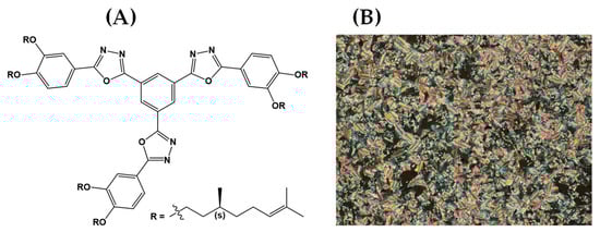 (A) The chemical structure of the LCcol. (B) The optical photomicrograph (33×) of compound showing mosaic textural pattern for LCcol at 25 °C. Samples were sandwiched between untreated glass slides and viewed through crossed polarizers.