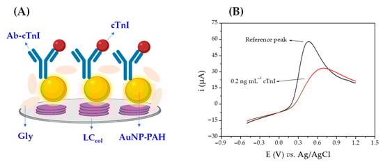 All the construction steps were followed by electrochemical characterization, as shown in Figure 4. After the heat treatment of the LCcol/GCE, it was possible to observe a reduction in the peak current to about 15% in relation to the bare GCE—evidence of a kinetically slower process. This modification was also accompanied by an increase in peak potentials—evidence that the process is becoming thermodynamically more unfavorable, which is attributed to the stacking of LCcol molecules in columns, generating an energy gap [32]. The same can be assessed regarding EIS (Figure S2B), which shows an increase in Rct when the same treatment was performed. Although there is a small blockage of the electrode surface by the film, it plays an important role in the development of the immunosensor, as the use of this semiconductor material promotes an amplification of the resistance response, which is used for the detection of cTnI by EIS. In addition, the AuNPs–PAH layer, used for the immobilization of ab-cTnI antibodies, interacts with this LCcol layer through intermolecular interactions. The combination of LCcol and AuNPs–PAH proved to be more stable than the materials used individually with the ab-cTnI. The use of AuNPs–PAH, in addition to being used for the immobilization of ab-cTnI, also contributed to the improvement of the electrochemical signal, resulting in an increase in the voltammetric signal, evidencing a facilitation of the electronic transfer process promoted by the addition of metallic nanostructures.