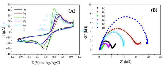 The CV measurements of the electroactive species such as Fe(CN)63−/4− are a valuable and convenient tool to monitor the blocking effect of the surface of the modified electrode, since the transfer of electrons between the electrode and the species in solution is dependent on the degree of coverage of the conductive surface [46]. The degree of inhibition of the faradaic process is closely related to the electrochemical properties of the films deposited on the electrode surface. This behavior was investigated by CV and EIS. Figure 4A shows the cyclic voltammograms after each assembly step on the LCcol/GCE platform. Figure 4A shows the formation of the LCcol film on GCE surface (voltammogram b), promoting a reduction in the anodic (ipa) and cathodic (ipc) peak currents for Fe(CN)63−/4− in relation to the bare GCE (voltammogram a). For the anodic peak, the drop was of 15% after heat treatment. The addition of AuNPs–PAH to the LCcol/GCE (Figure 4A—voltammogram c) causes a 23% increase in the voltammetric response due to the higher conductivity of the nanostructures. After immobilization of the ab-cTnI antibody to the electrode modified with AuNPs–PAH/LCcol/GCE, a reduction in currents of about 22% and an increase in peak separation for the redox probe Fe(CN)63−/4− in PBS (0.01 mol L−1, pH 7.5) was observed (Figure 4A—voltammogram d) due to the insulating characteristics of the protein [44]. The adsorption of gly (Figure 4A—voltammogram e) to block non-specific binding sites promoted a current reduction of 5.5% in relation to electrode d. After the incubation of the gly/ab-cTnI/AuNPs–PAH/LCcol/GCE with 0.3 ng mL−1 of cTnI (Figure 4A—voltammogram f), a further reduction in the voltammetric peaks of around 10% was observed due to the formation of the immunocomplex on the immunosensor surface. The same process can be better observed by EIS (Figure 4B).