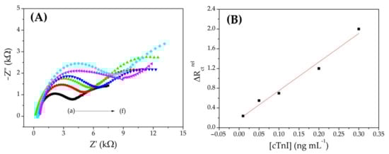 (A) Nyquist diagrams obtained in open circuit mode, with 10 mV amplitude and frequency range of 0.1–100,000 Hz with the immunosensor for cTnI in (a) PBS (0.01 mol L−1, pH 7.5) containing 1.0 × 10−2 mol L−1 of Fe(CN)63−/4− and after 10 min of incubation with: (b) 0.01, (c) 0.05, (d) 0.1, (e) 0.2, and (f) 0.3 ng mL−1 cTnI. (B) Impedimetric calibration curve for cTnI.
