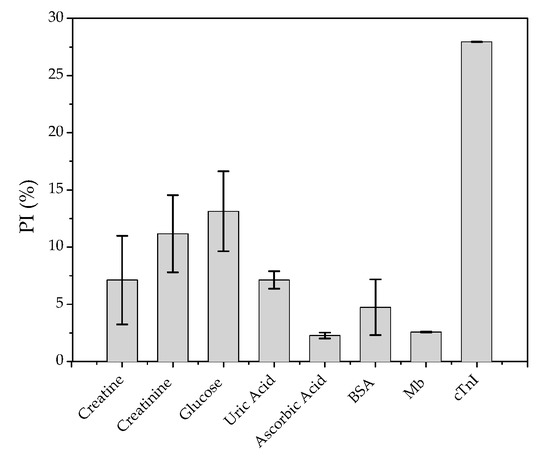 Reproducibility and specificity are important analytical parameters for a sensor. Under optimized conditions, a concentration of 0.05 ng mL−1 of cTnI was detected under six repetitions in individuals, which presented a relative standard deviation of 8.1%, verifying the accuracy of the immunosensor proposed. The specificity of the immunosensor is also a critical parameter of operation, for which different interferents were evaluated, as described above. As seen in Figure 7, only creatinine and glucose caused a noticeable decrease in peak signal, slightly greater than 10%. The other tested interferents showed a response of less than 10% when compared to the response with cTnI, including with another cardiac marker, Mb, showing that the studied immunosensor has greater selectivity for cTnI.