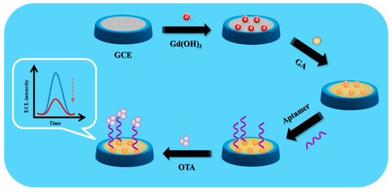 Firstly, the polished glass carbon electrode (GCE) was modified with 5 μL Gd(OH)3 solution (1 mg mL−1) dissolved by ethanol and dried naturally. Next, 5 μL GA (2%), as a crosslinking agent, was dripped in GCE modified with Gd(OH)3 reacting for 2 h. Then, the excess GA was washed by PBS (0.1 M, pH 7.4) solution, the obtained GCE was named Gd(OH)3/GCE. Subsequently, the obtained Gd(OH)3/GCE incubated in 5 μL adapter solution for 2 h at 37 °C. Due to the presence of GA, the adapter could be fixed to the surface of Gd(OH)3/GCE, which was named Apt/Gd(OH)3/GCE. Finally, the obtained Apt/Gd(OH)3/GCE was used as ECL material and incubated in 100 μL of different concentrations of OTA solutions for 2 h at 37 °C to fabricate a novel ECL aptasensor. It is worth mentioning that after each incubation step, the GCE was washed with PBS (0.1 M, pH 7.4), avoiding non-specific binding, and, finally, dried under nitrogen. Other experimental conditions were as follows: the scanning potential was −2.0~0 V, the scanning speed was 100 mV S−1, and the photomultiplier tube was 800 V.