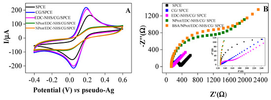 (A) Cyclic voltammograms and (B) EIS measurements of bare SPCE (black), CG/SPCE (blue), EDC-NHS/CG/SPCE (magenta), N protein/EDC-NHS/CG/SPCE (green), and BSA/N protein/EDC-NHS/CG/SPCE (orange), in 5 mmol L−1 [Fe(CN)6]3−/4− + 0.1 mol L−1 KCl.