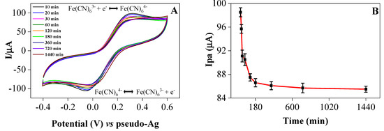 Stability of the immunosensor through cyclic voltammetry in 5 mmol L−1 [Fe(CN)6]3−/4− + 0.1 mol L−1 KCl.