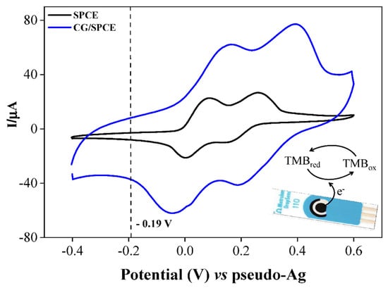 CV was used to investigate the oxidation and reduction process of the TMB on a SPCE, by scanning the potential between −400 and 600 mV at a scan rate of 50 mV s−1. Figure 4 shows the cyclic voltammograms obtained for bare SPCE and CG/SPCE.