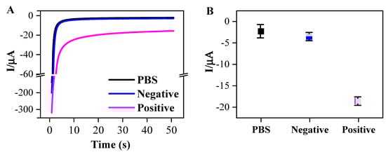 (A) Chronoamperograms recorded with PBS, negative and positive controls. Applied potential of −0.19 V vs. pseudo-Ag. (B) Current values on the steady-state, negative reference serum, and PBS.