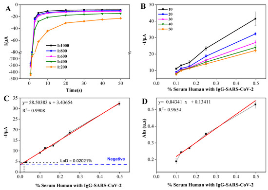 An indirect electrochemical assay was used to estimate the antibody levels in the serum samples. In Figure 6C, the calibration curves were plotted using absolute values of stable current recorded at time 20 s against the concentration of IgG-SARS-CoV-2 present in the samples. The performance of the immunosensor was evaluated using human serum positive for SARS-CoV-2 concentrations, including 1:1000, 1:800, 1:600, 1:400, and 1:200. It can be observed that the current values increase proportionally with an increase in the concentration of IgG-SARS-CoV-2. The resulting average current values (n = 3) were established using the regression equation: According to the Miller and Miller method [45], the detection limit of our system was determined taking into account the variability of the chronoamperometric current that was obtained in positive samples (samples without IgG-SARS-CoV-2). The limit of detection (LOD) of our system was determined considering the variability of the chronoamperometric current obtained in the blank samples. The lower LOD was calculated as 3× the standard deviation (SD) blank divided by the slope of the calibration curve. This limit was established as a current value of 4.59 µA corresponding to a % concentration of IgG-SARS-CoV-2 of 0,02021%, which is equivalent to a dilution factor of 1:4954. A linear graph is obtained with R2 of 0.9908, indicating that the time at 20 s is suitable for this study. The resolution of the curve fitting indicated a sensitivity (expressed as the slope of the I vs. % human serum with IgG-SARS-CoV-2) of 3.43654/% human serum with IgG-SARS-CoV-2 in the range from 1:1000 to 1:200 v/v. As shown, the fabricated biosensor can be used for the detection of IgG-SARS-CoV-2 in real human serum sample.