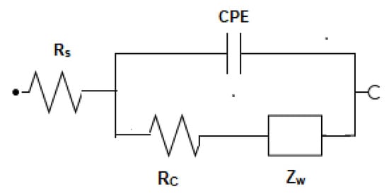 Equivalent circuit for Nyquist plots. RS, solution resistance; CPE, constant phase element; Rc, electron-transfer resistance; ZW, Warburg element due to diffusion of the redox couple ([Fe(CN)6]4−/[Fe(CN)6]3−) to the interface from the bulk interface from the bulk of the electrolyte.