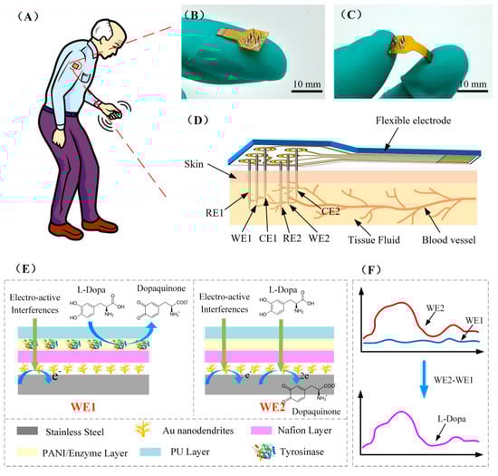 (A) Schematic diagram of the minimal-invasive L-Dopa sensor used for the dynamic monitoring of L-Dopa in Parkinson’s patient. (B,C) Photograph of FDMA. (D) Schematic diagram of minimally invasive subcutaneous implantation of FDMA. (E) Schematic diagram of the surface modification structure of the working electrode WE1 and WE2, and the reaction process of L-Dopa and other electro-active interferences on the electrode surface. (F) The current response signal of WE1 and WE2 and the L-Dopa differential detection principle.