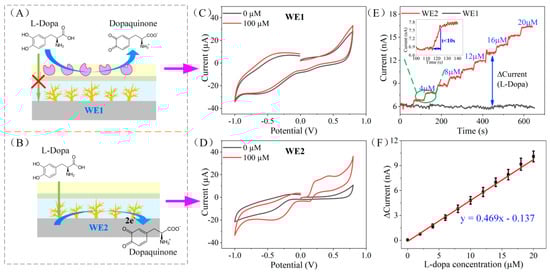 (A,B) The L-Dopa detection principle of the working electrode WE1 and WE2. (C,D) The CV response of WE1 and WE2 to 0 μM and 100 μM L-Dopa in 0.01 M PBS solution. (E) The amperometric response of WE1 and WE2 to the dynamic concentration change of L-Dopa (0–20 μM). The inset is an enlarged view of the amperometric response of WE2 from 100 s to 140 s. (F) Calibration curve of the L-Dopa concentration vs. current response difference of WE1 and WE2.