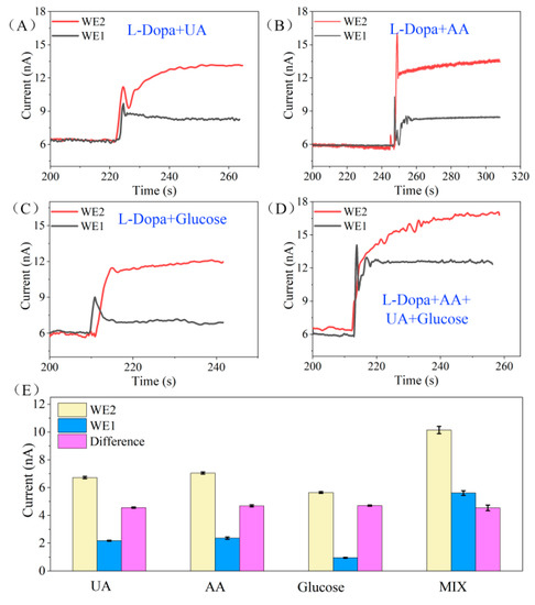 Figure 4E displays the histogram of the current response of WE1 and WE2 to different interference mixture solutions and the corresponding current differential values. The sensor’s responses to 10 μM L-Dopa (presented as the current difference between WE1 and WE2) under the coexistence of interference are as follows: 4.98 nA in L-Dopa + UA solution, 4.63 nA in L-Dopa + AA solution, 5.08 nA in L-Dopa + glucose solution, and 4.65 nA in the mixture of L-Dopa + UA + AA + glucose solution. The average response of the sensor is 4.835 nA, and the standard deviation is 4.7%. According to our previous study, in the absence of interference, the current response of the sensor to 10 μM L-Dopa is 4.69 nA (calculated from Figure 3F). The response difference of the sensor in the interference and non-interference solution is less than 5%, indicating that the differential structure provides the sensor with excellent anti-interference ability.
