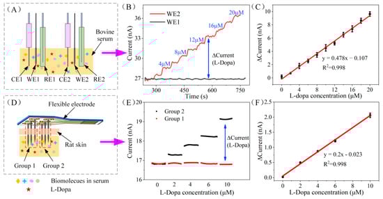 The amperometric response of the two working electrodes, WE1 and WE2, was also measured in bovine serum under the applied potential of 0.3 V (Figure 5A). As illustrated in Figure 5B, similar to the response in PBS, the current response of WE2 increased with the increase of L-Dopa concentration and showed a good correlation, while the current of WE1 hardly changed. We noticed that the current baseline of these two electrodes in serum was significantly higher than that of PBS (6 nA in PBS and 27 nA in serum). This is because a large number of biomolecules in the serum may also be oxidized on the surface of the electrode, thereby increasing the oxidation current of the electrode. Meanwhile, the adsorption of biomolecules and proteins on the electrode surface in the serum reduced the diffusion rate of L-Dopa, so the electrode response in the serum took longer to stabilize (about 15 s) than in the PBS (less than 10 s). Although the interferents in serum have an impact on the baseline and response time of the sensor, the sensitivity of the sensor has not changed (as shown in Figure 5C), indicating that whether in PBS or serum, the differential structure can effectively eliminate the influence of interfering substances.