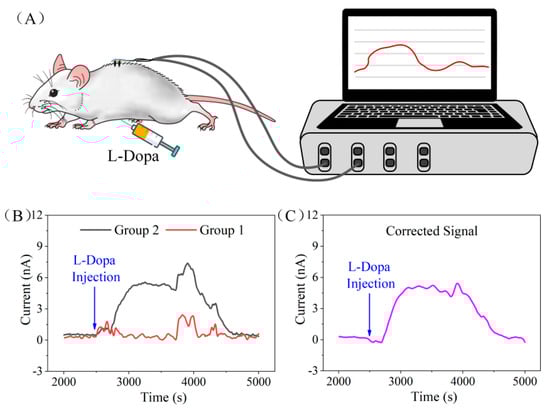 After the successful evaluation of the FDMA by chronoamperometry with skin model, we tested the sensor in vivo through minimally invasive monitoring of L-Dopa concentration. As demonstrated in Figure 6A, each group of the FDMA was connected to an electrode channel of the dual electrochemical workstation, respectively, and the current response of both groups was recorded simultaneously. During the measurements, the FDMA was stabilized subcutaneously for approximately 2500 s at a voltage of 0.3 V, and then 4 mL of 8 mM L-Dopa was injected into the rat’s abdominal cavity. The dosage of L-Dopa for the rat was based on previous studies, which was equivalent to 300 mg of L-Dopa for adults [42].