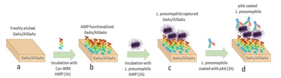 The 2 mm × 2 mm GaAs chips (bulk or GaAs/AlGaAs nanoheterostructures) were cleaned by successive dipping in acetone, OptiClear, and isopropanol for 5 min under ultrasonication and then dried with highly pure compressed nitrogen gas [46,47]. Thereafter, native oxides present on the surface of samples were removed by immersion in 28% NH4OH for 2 min at room temperature, followed by rinsing with degassed ethanol and subsequently degassed deionized (DI) water. Then, individual samples were incubated in each of the thiolated AMP solutions (50 µg/mL) for 1 h to allow for the Cys-AMPs attachment to the GaAs surface through the formation of covalent bonds between Ga or As atoms and the cysteine sulfur (S). The functionalized chips were sonicated in degassed DI water for 1 min and immediately rinsed with degassed DI water to remove noncovalently bound peptides and subsequently incubated in bacterial suspensions for 1h. Bacterial-bound chips were rinsed with DI water to remove unbound or loosely bound bacteria. The bacteria decoration step with anti-L. pneumophila pAb was completed by incubation with 100 μg/mL anti-L. pneumophila pAb for 30 min. This concentration of pAb is considered sufficient to saturate bacteria in a reproducible fashion. The procedure of biochip preparation is schematically illustrated in Figure 1.