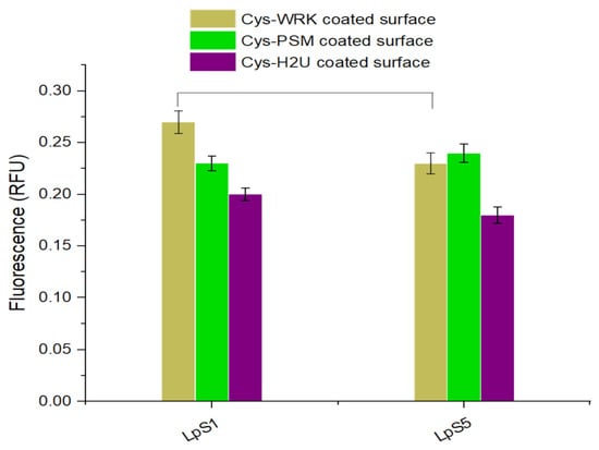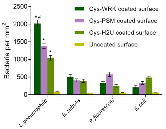 These results illustrate that the investigated peptides bind L. pneumophila more efficiently than the other investigated bacteria, consistent with earlier reports [60,61,62]. Furthermore, the Cys-WRK AMP has a significantly higher binding affinity towards L. pneumophila than the other investigated peptides. This superior performance in capturing L. pneumophila could be related to the lipid composition of the L. pneumophila membrane. For instance, it has been reported by Verdon, et al. [63] that the presence of branched-chain fatty acids, such as C15:0, C 16:0, and C 17:0 on the surface of L. pneumophila is associated with bacterial specificity of warnericin RK AMP. Another study has suggested that the high proportion (30%) of phosphatidylcholine, also known as lecithin, on the outer membrane of Legionella leads to a specific interaction with the Cys-WRK peptide [64,65]. Marchand, Augenstreich, Loiseau, Verdon, Lecomte, and Berjeaud [61] reported that two specific amino acids present in the Cys-WRK sequence at the 4th and 17th position are also associated with the specific interaction between peptide and L. pneumophila. Nevertheless, more study is required to further elucidate the reasons for the enhanced specific interaction between the Cys-WRK peptide and L. pneumophila bacteria.