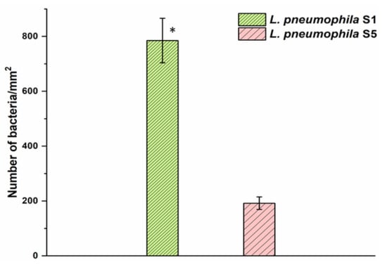 The capture efficiency of L. pneumophila SG1 and SG5 with pAb-functionalized GaAs surface. Error bars represent standard error of the mean from three separate experiments. The asterisk indicates significantly different values compared to the reference as determined by the Student’s test (n = 3, p < 0.05).