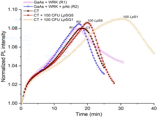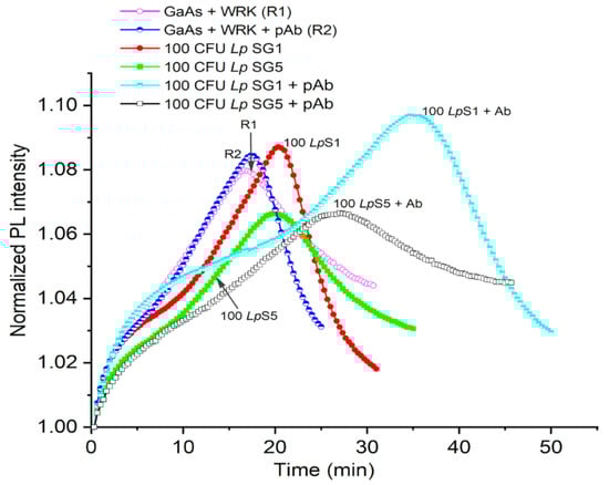 A greater delay of the PL maximum observed in Figure 5 for L. pneumophila SG1 compared to SG5 (~11 min) is consistent with the relatively greater selectivity of the pAb towards L. pneumophila SG1 (see Figure 3). Furthermore, the exposure of a reference sample to the pAb alone did not show a significant change in the delay of a PL-intensity maximum (blue semicircles), which is related to the weak pAb–AMP interaction [68]. We also observed similar response of the GaAs/AlGaAs biochips to 50 CFU/mL of L. pneumophila SG1 and SG5 decorated with pAbs, as shown in Table 1 (see Figure S5 in Supplementary Information). These results are consistent with the observation that decorating L. pneumophila SG1 with negatively charged SDS molecules significantly enhanced the sensitivity of DIP biosensors as reported in [23].