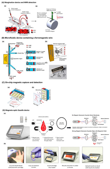 The relatively large paramagnetic susceptibility of hemozoin particles induces substantial changes in the transverse relaxation rate, T2, of proton nuclear magnetic resonance (NMR) of RBCs, which can be used to correlate with the presence of infected RBCs during malaria infection [80]. This idea was first pointed out by Karl et al. who show that it is possible to carry out NMR relaxometry on infected RBCs but concluded that it was unlikely to have enough sensitivity for malaria diagnosis in the field settings [81]. They demonstrate their studies using unprocessed raw blood [81]. Then, Peng and co-workers demonstrated that it was indeed possible to have a highly sensitive malaria diagnosis by focusing on the infected RBCs, using a simple trick of standard hematocrit centrifugation (from normal RBCs) [80,82,83,84,85]. The authors concluded this in their mouse studies where a highly sensitive detection compared to the current methods was reported (less than 10 parasites/µL versus 50–200 parasites/µL and 100–200 of microscopy and RDTs, respectively) [80]. Following this unprecedented development, several similar studies were reproduced [47,86,87,88], and new techniques were established to improve the infected RBCs separation (using microfluidics) and exploited for drugs studies [89]. In fact, Kong et al. [44] combined lab-on-a-chip microfluidics and magnetic resonance relaxometry (MRR) in order to accurately detect malaria infection (as shown in Figure 3A). The authors used margination-based microfluidics that separates infected and non-infected RBCs based on their different deformability. By doing so, infected RBCs were concentrated, facilitating infection detection. This was followed by infected RBCs lysis and MRR detection, based on paramagnetic hemozoin detection. By doing this, the authors were able to detect as low as to 0.0005% of parasitemia of early-stage P. falciparum-infected RBCs [44]. Based on the same RBCs count/µL of blood [71], the parasitemia is similar to the one of microscopy, 50 parasites/µL of blood. To avoid false-positive and -negative results, it is mentioned that each sample is analyzed 5–10 times in the MRR, which takes around 5–10 min [44]. The authors believe that both microfluidics design and MRR detection might be optimized to provide more sensitive and sensible results [44]. Furthermore, there is the possibility of miniaturizing both systems in a lab-on-a-chip, and despite the elevated cost of this (several thousands of USD), the cost per assay (less than USD 0.50) would be almost comparable with microscopy (USD 700–3000 for the instrument and USD 0.12–0.40 per test) and RDTs (USD 0.55–1.50 per test) [12,44].